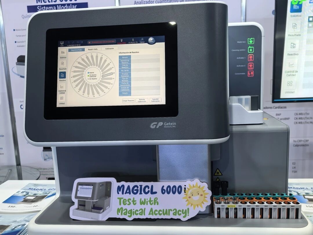 In Tecnosalud exhibition, Getein Biotech showcased multiple fully self-developed medical devices, including MAGICL 6000 Fully Automated Chemiluminescence Immunoassay Analyzer, GN 7000 AKSO PCR System, as well as Getein 1150 and Getein 1160 Immunofluorescence Quantitative Analyzers, which attracted significant attention from numerous attendees.